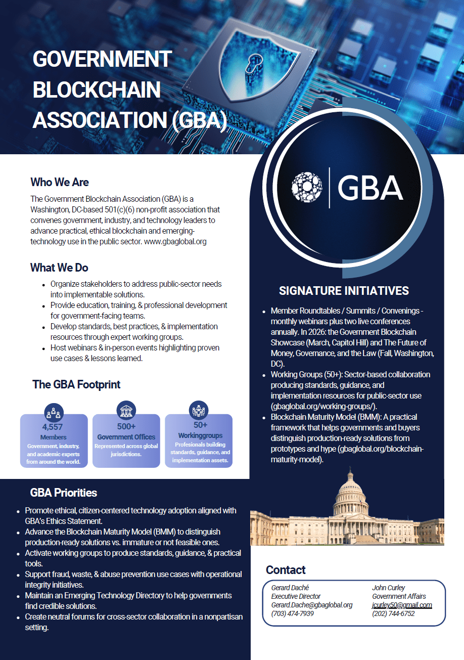 The Government Blockchain Association (GBA) is a membership organization with members that work in over 500 government offices around the world. It also has private sector members.