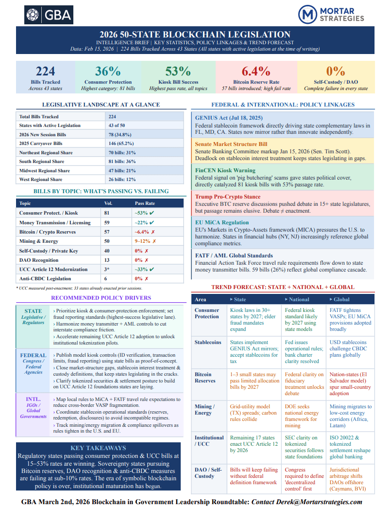 The “50-State Blockchain Legislation” one-pager from the Government Blockchain Association provides a concise overview of how blockchain and digital asset legislation is evolving across the United States. It highlights key policy trends, legislative activity, and regulatory approaches being taken by individual states, illustrating the growing role of state governments in shaping the legal environment for blockchain technology, digital assets, and related innovations. The document summarizes the types of laws being introduced or enacted—such as those addressing digital asset classification, blockchain business regulation, financial services, and technology adoption—while emphasizing the uneven and rapidly developing regulatory landscape across all 50 states. Overall, the one-pager serves as a quick reference for policymakers, industry leaders, and stakeholders seeking to understand the scope and direction of blockchain-related legislation at the state level in the U.S.